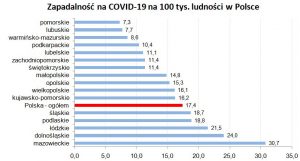 „Zapadalność w Polsce na Covid-19 na 100 tys. wynosi 17,4. Najwyższe wskaźniki odnotowujemy w województwie