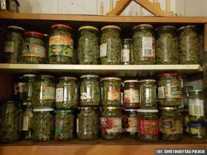 Słoiki po ogórkach z inną zieloną, nielegalną zawartością